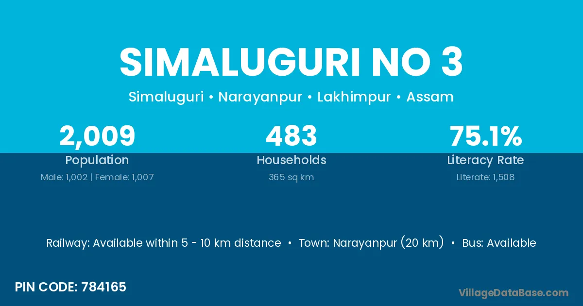 Narayanpur (20 km) is the nearest town to Simaluguri No 3 village for major economic activities and is located approximately 20 km away.
