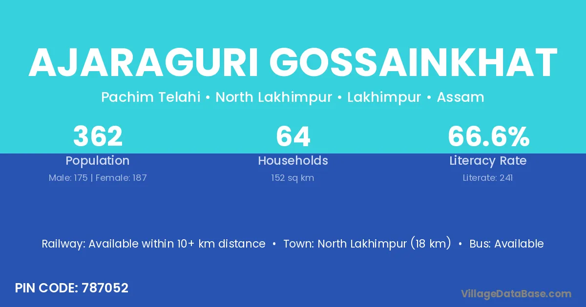 Ajaraguri Gossainkhat village has a total population of 362 people, of which 175 are males and 187 are females.