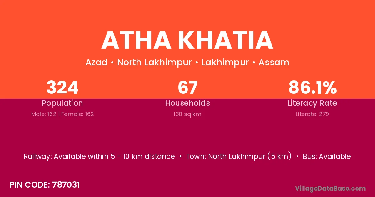 North Lakhimpur (5 km) is the nearest town to Atha Khatia village for major economic activities and is located approximately 5 km away.