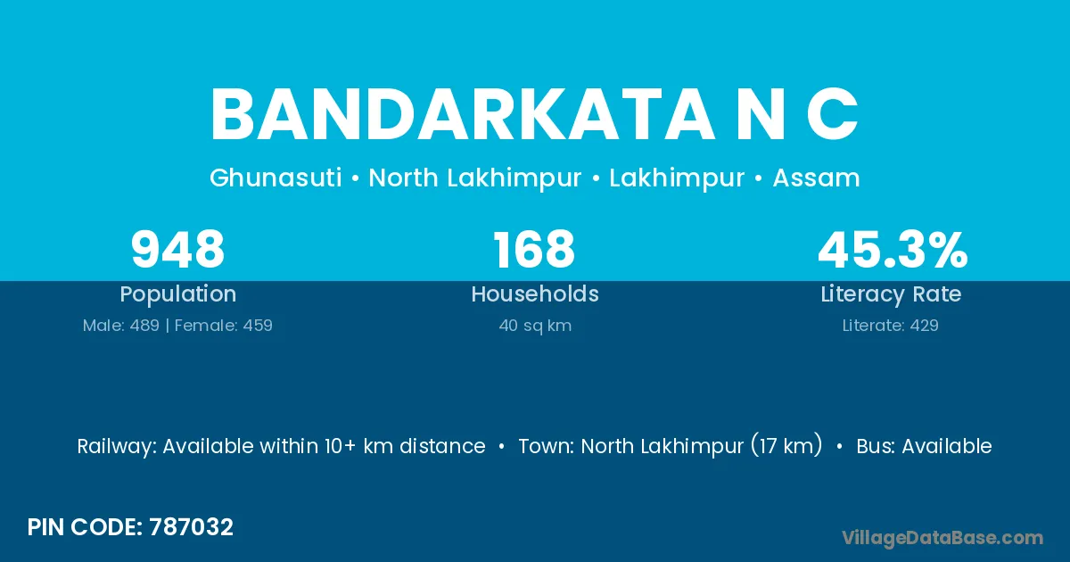 North Lakhimpur (17 km) is the nearest town to Bandarkata N C village for major economic activities and is located approximately 17 km away.