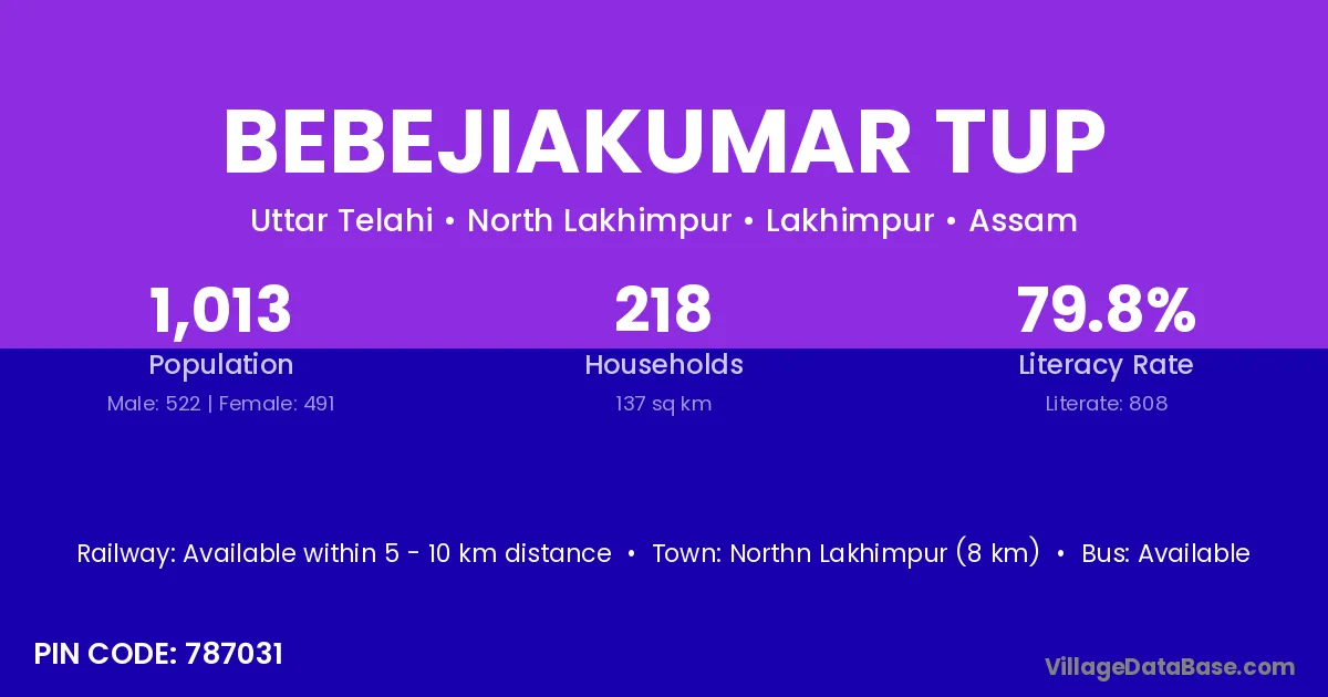 Northn Lakhimpur (8 km) is the nearest town to Bebejiakumar Tup village for major economic activities and is located approximately 8 km away.