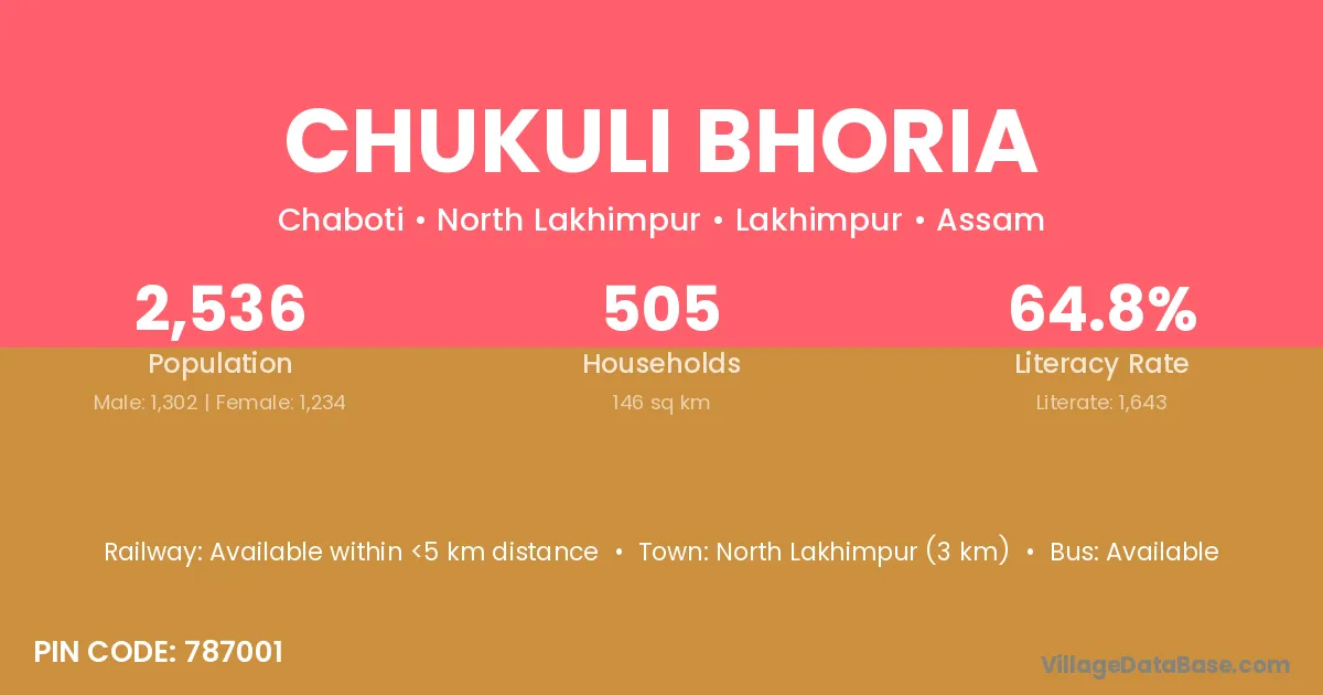 North Lakhimpur (3 km) is the nearest town to Chukuli Bhoria village for major economic activities and is located approximately 3 km away.