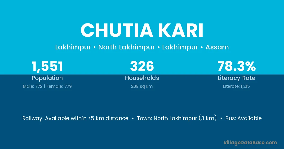 Chutia Kari village has a total population of 1,551 people, of which 772 are males and 779 are females.