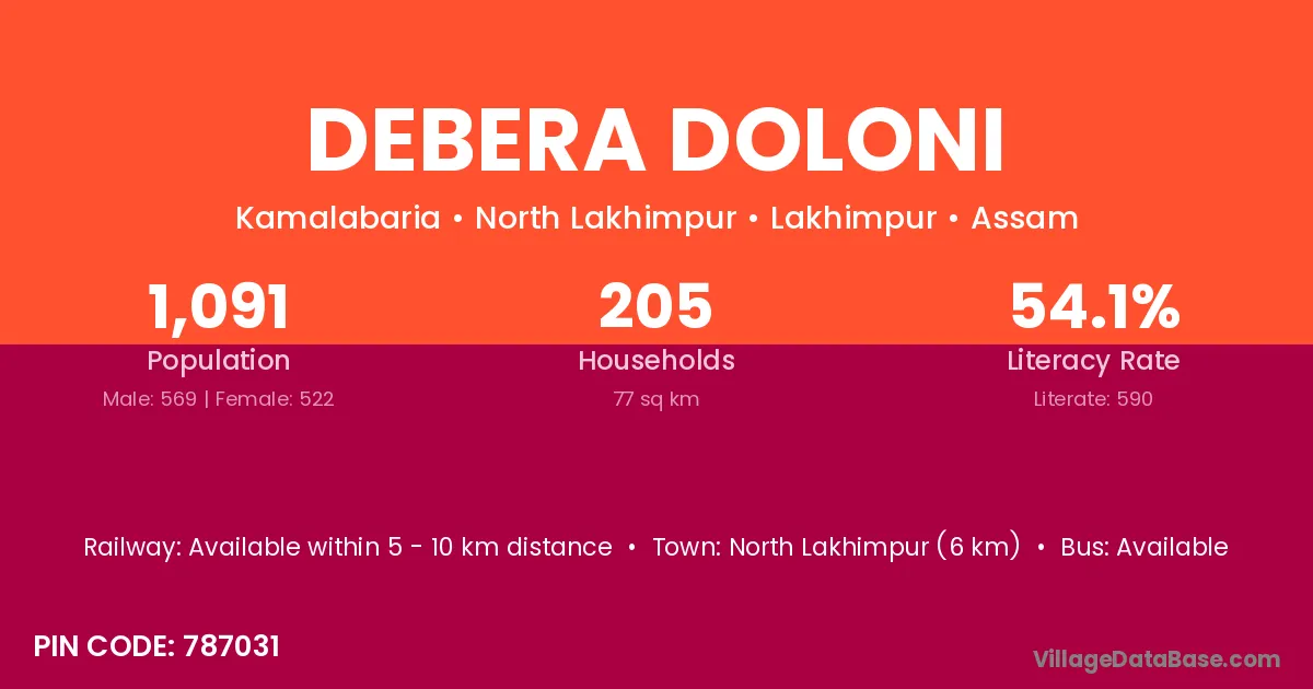 North Lakhimpur (6 km) is the nearest town to Debera Doloni village for major economic activities and is located approximately 6 km away.