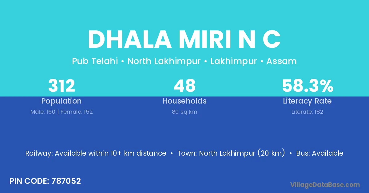 North Lakhimpur (20 km) is the nearest town to Dhala Miri N C village for major economic activities and is located approximately 20 km away.