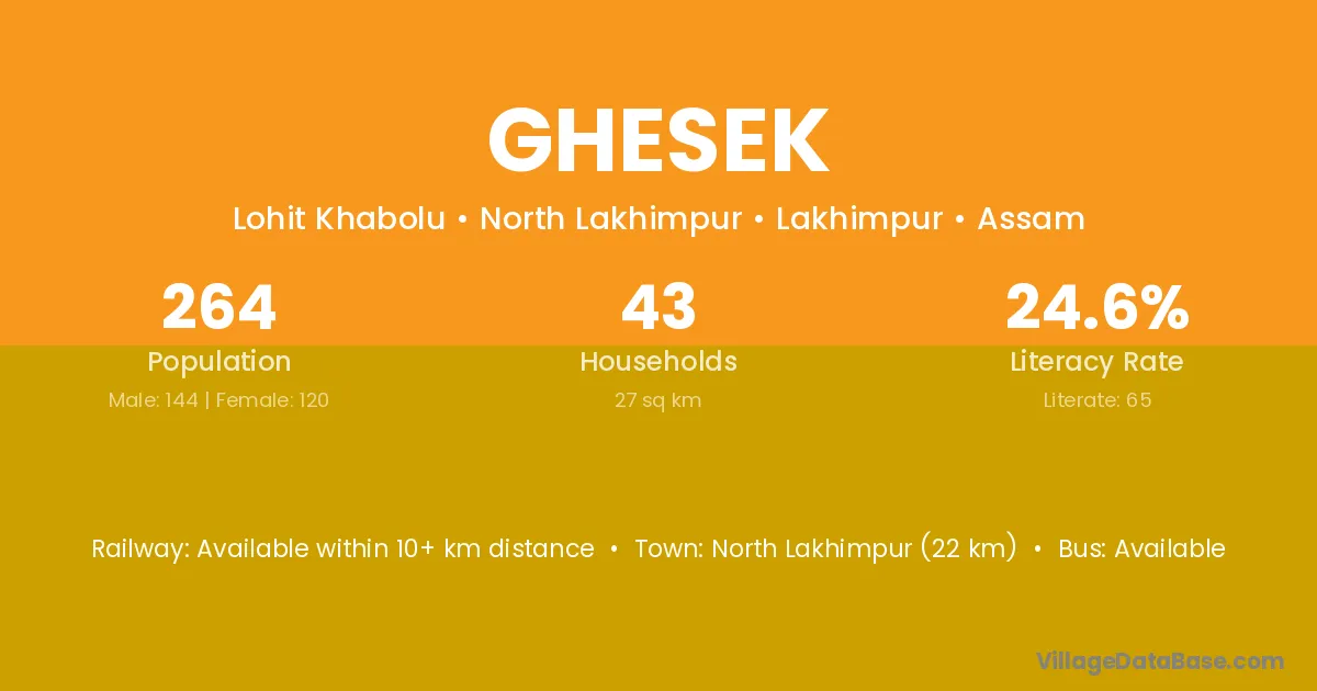 North Lakhimpur (22 km) is the nearest town to Ghesek village for major economic activities and is located approximately 22 km away.