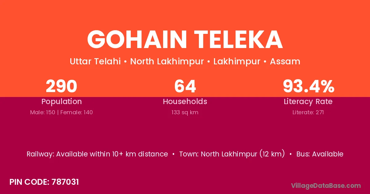 Gohain Teleka village has a total population of 290 people, of which 150 are males and 140 are females.