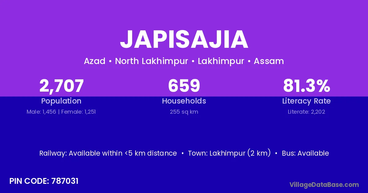 Lakhimpur (2 km) is the nearest town to Japisajia village for major economic activities and is located approximately 2 km away.