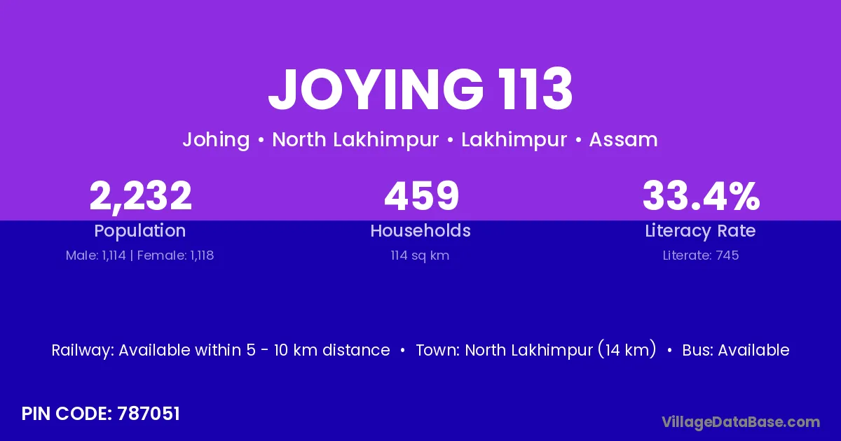North Lakhimpur (14 km) is the nearest town to Joying 113 village for major economic activities and is located approximately 14 km away.