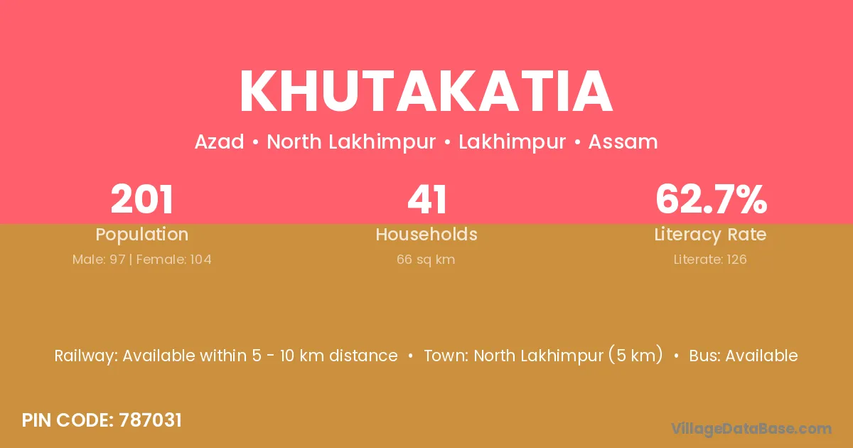 Khutakatia village has a total population of 201 people, of which 97 are males and 104 are females.