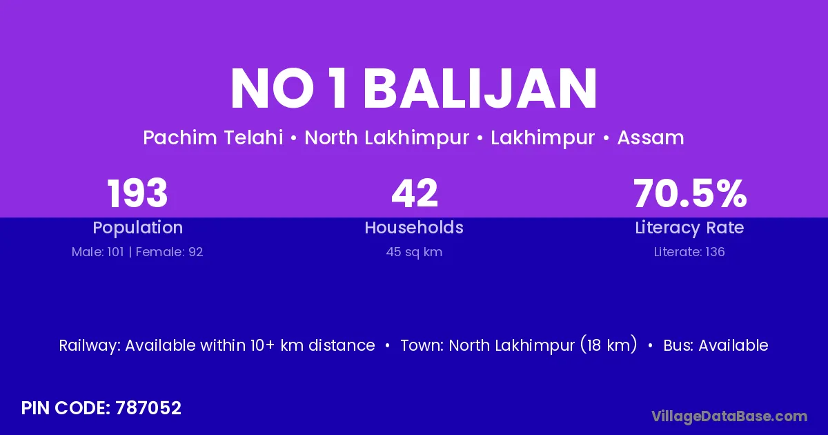 North Lakhimpur (18 km) is the nearest town to No 1 Balijan village for major economic activities and is located approximately 18 km away.