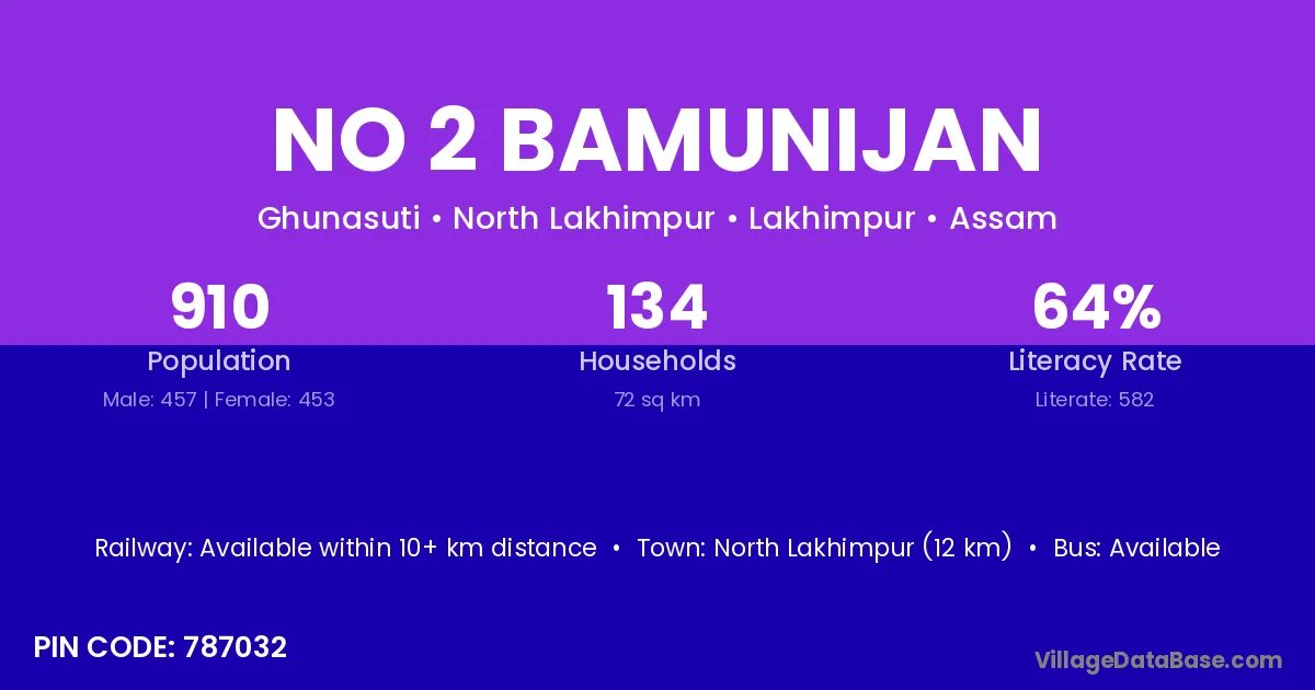 No 2 Bamunijan village has a total population of 910 people, of which 457 are males and 453 are females.
