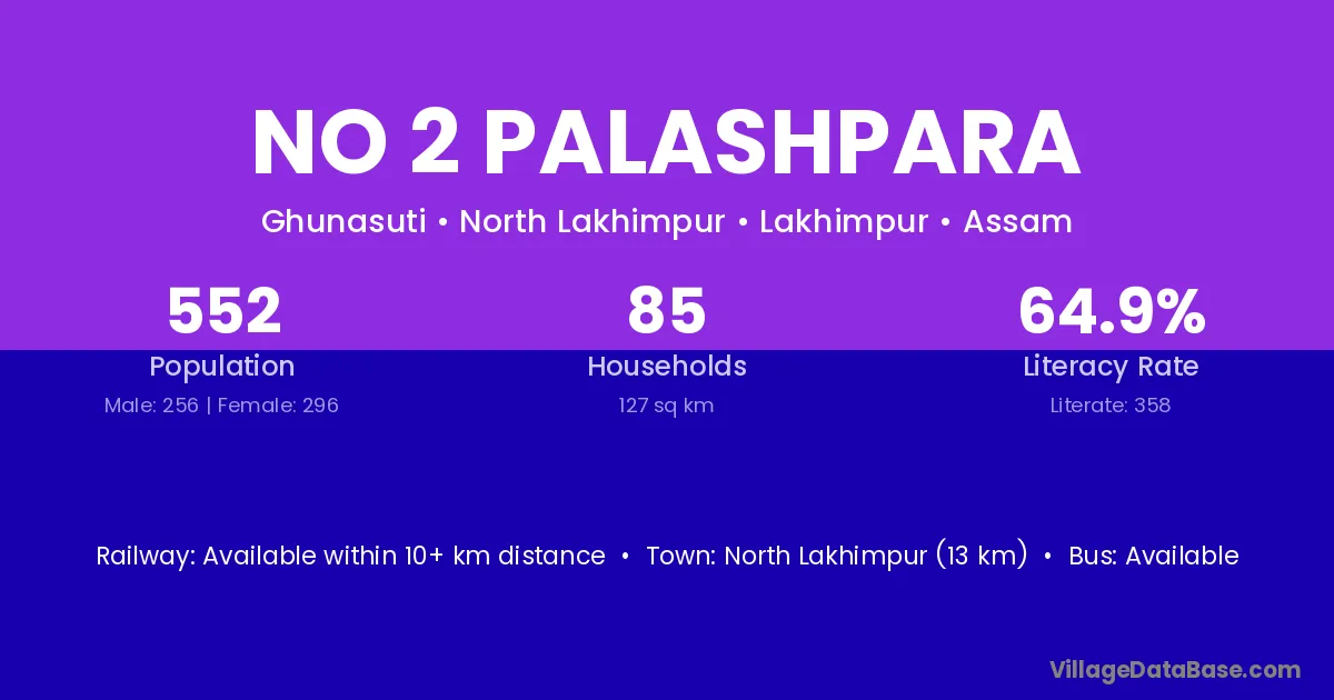 North Lakhimpur (13 km) is the nearest town to No 2 Palashpara village for major economic activities and is located approximately 13 km away.