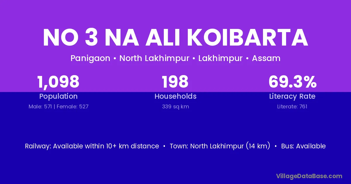 North Lakhimpur (14 km) is the nearest town to No 3 Na Ali Koibarta village for major economic activities and is located approximately 14 km away.