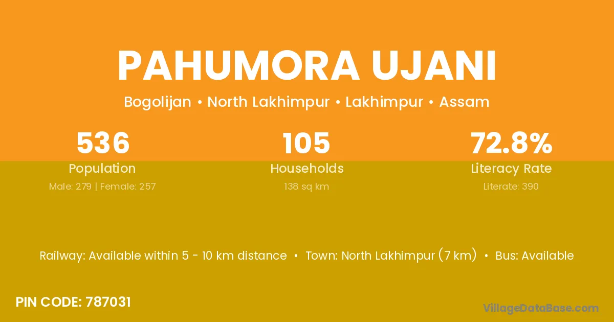 North Lakhimpur (7 km) is the nearest town to Pahumora Ujani village for major economic activities and is located approximately 7 km away.