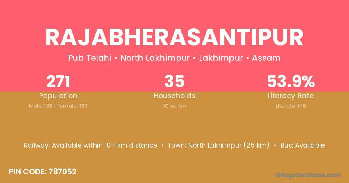 North Lakhimpur (25 km) is the nearest town to Rajabherasantipur village for major economic activities and is located approximately 25 km away.