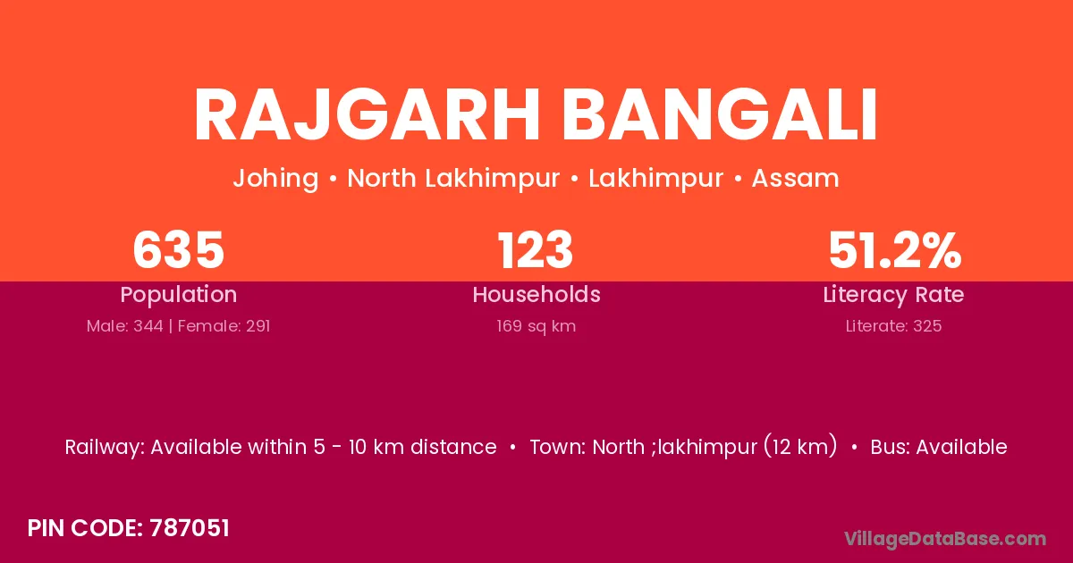 North ;lakhimpur (12 km) is the nearest town to Rajgarh Bangali village for major economic activities and is located approximately 12 km away.