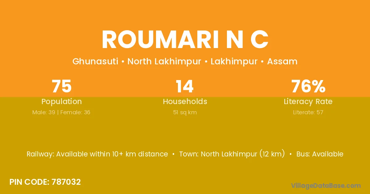 North Lakhimpur (12 km) is the nearest town to Roumari N C village for major economic activities and is located approximately 12 km away.
