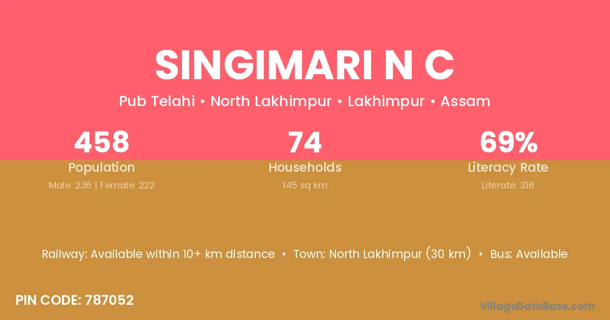 Singimari N C village has a total population of 458 people, of which 236 are males and 222 are females.