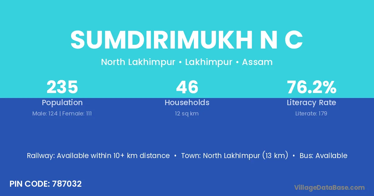 North Lakhimpur (13 km) is the nearest town to Sumdirimukh N C village for major economic activities and is located approximately 13 km away.