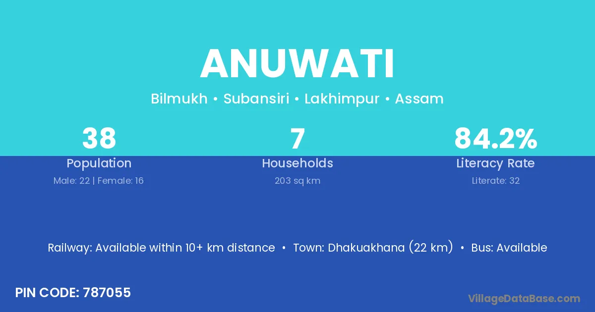 Dhakuakhana (22 km) is the nearest town to Anuwati village for major economic activities and is located approximately 22 km away.