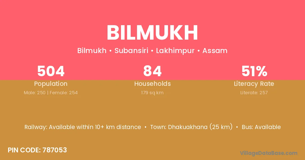 Dhakuakhana (25 km) is the nearest town to Bilmukh village for major economic activities and is located approximately 25 km away.