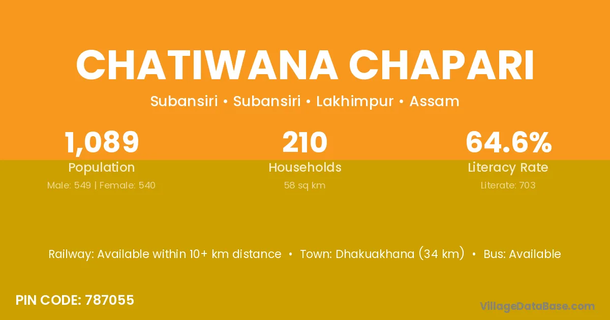 Dhakuakhana (34 km) is the nearest town to Chatiwana Chapari village for major economic activities and is located approximately 34 km away.