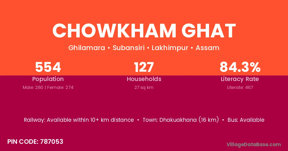 Dhakuakhana (16 km) is the nearest town to Chowkham Ghat village for major economic activities and is located approximately 16 km away.