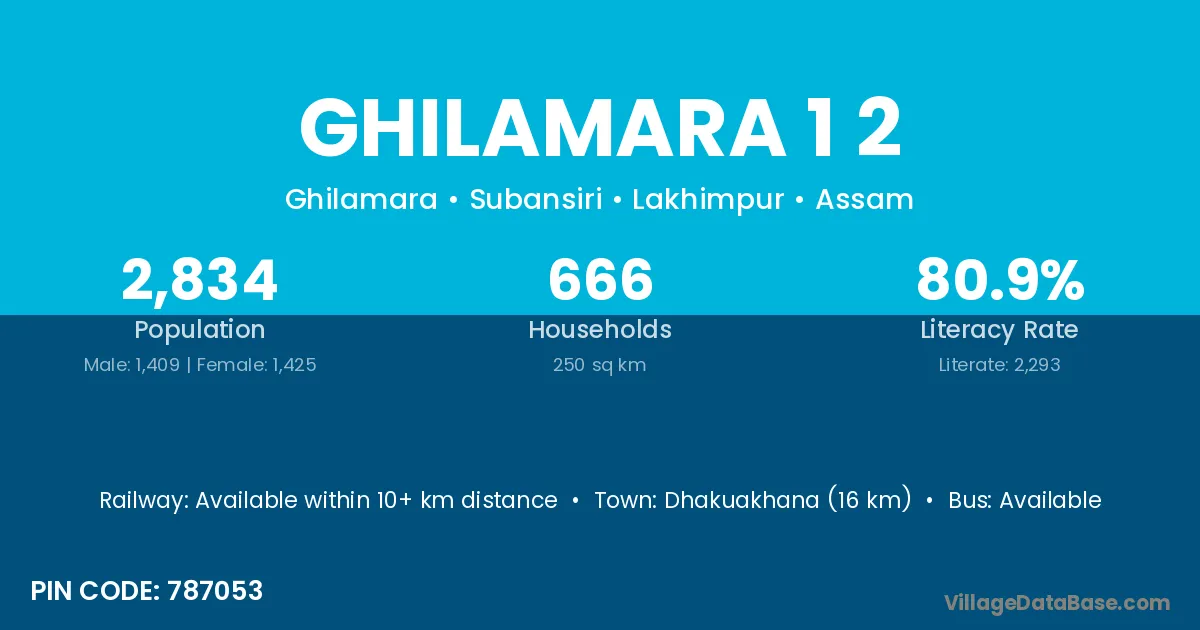 Dhakuakhana (16 km) is the nearest town to Ghilamara 1 2 village for major economic activities and is located approximately 16 km away.