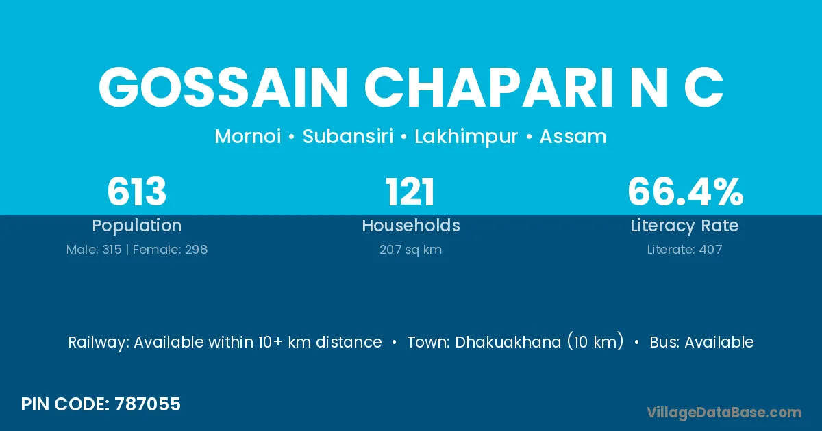 Dhakuakhana (10 km) is the nearest town to Gossain Chapari N C village for major economic activities and is located approximately 10 km away.