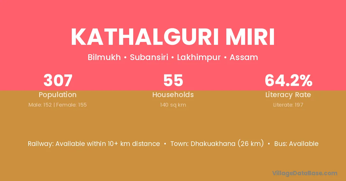 Dhakuakhana (26 km) is the nearest town to Kathalguri Miri village for major economic activities and is located approximately 26 km away.