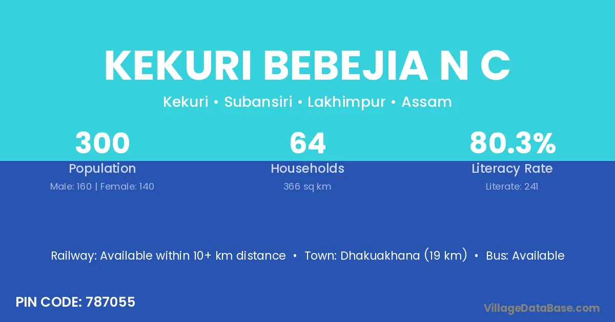 Dhakuakhana (19 km) is the nearest town to Kekuri Bebejia N C village for major economic activities and is located approximately 19 km away.