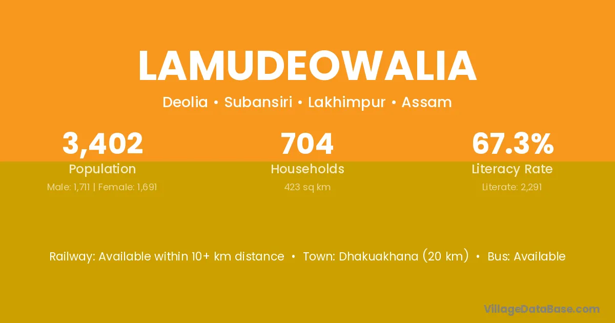 Dhakuakhana (20 km) is the nearest town to Lamudeowalia village for major economic activities and is located approximately 20 km away.
