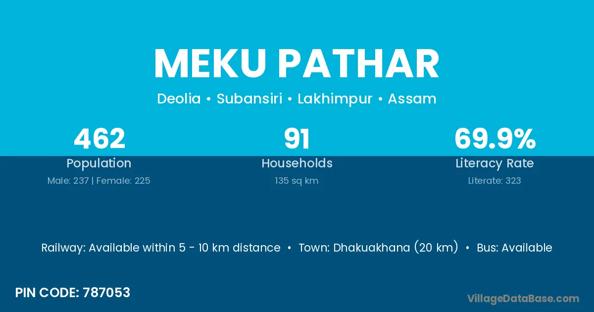 Dhakuakhana (20 km) is the nearest town to Meku Pathar village for major economic activities and is located approximately 20 km away.