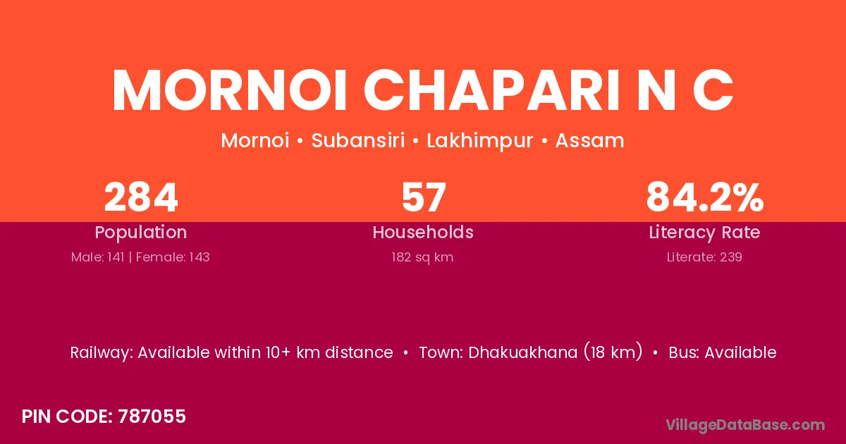 Dhakuakhana (18 km) is the nearest town to Mornoi Chapari N C village for major economic activities and is located approximately 18 km away.