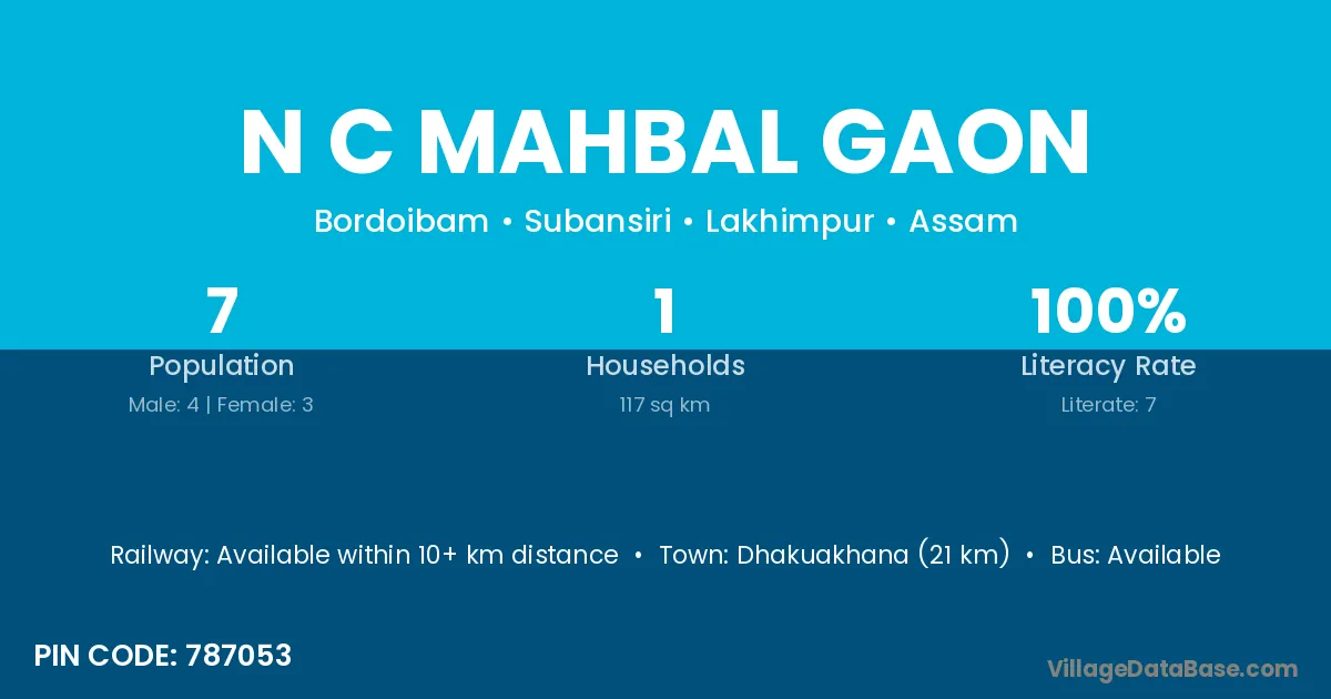 Dhakuakhana (21 km) is the nearest town to N C Mahbal Gaon village for major economic activities and is located approximately 21 km away.