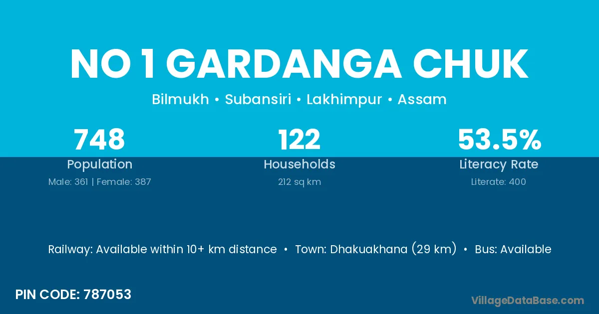 Dhakuakhana (29 km) is the nearest town to No 1 Gardanga Chuk village for major economic activities and is located approximately 29 km away.