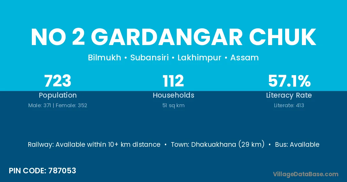 Dhakuakhana (29 km) is the nearest town to No 2 Gardangar Chuk village for major economic activities and is located approximately 29 km away.