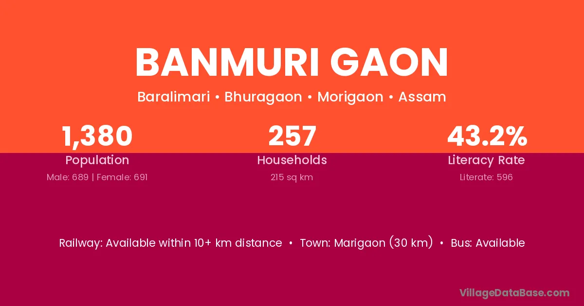 Banmuri Gaon village has a total population of 1,380 people, of which 689 are males and 691 are females.