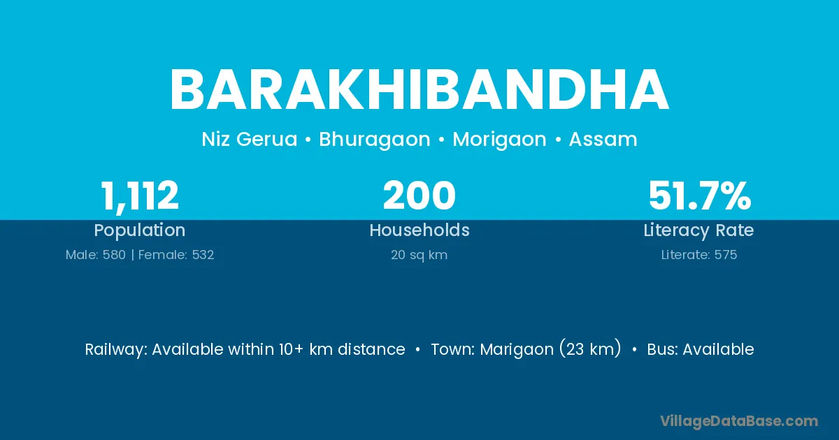 Marigaon (23 km) is the nearest town to Barakhibandha village for major economic activities and is located approximately 23 km away.