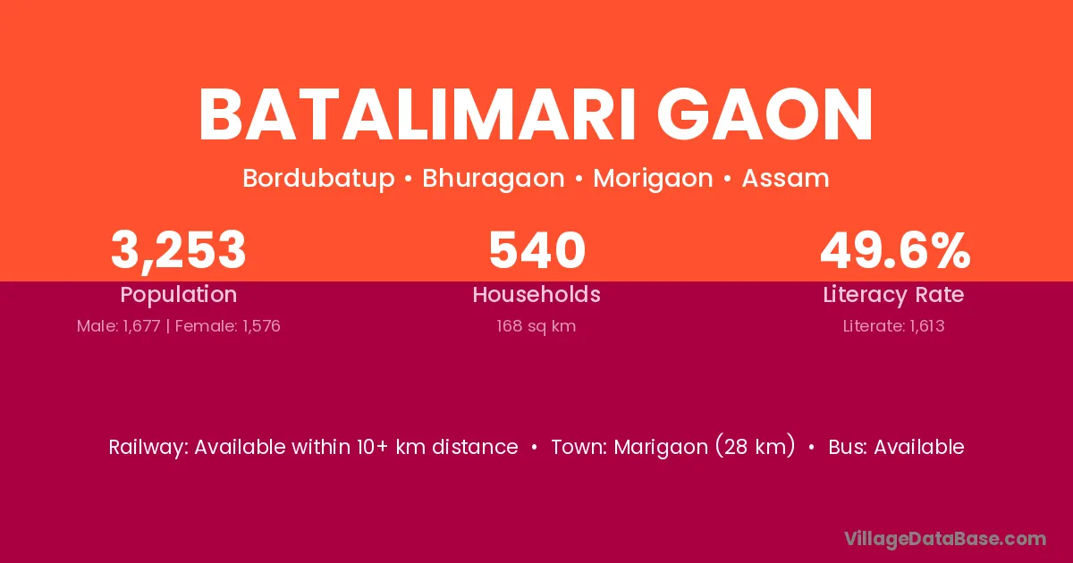 Marigaon (28 km) is the nearest town to Batalimari Gaon village for major economic activities and is located approximately 28 km away.