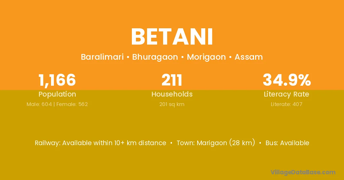 Marigaon (28 km) is the nearest town to Betani village for major economic activities and is located approximately 28 km away.
