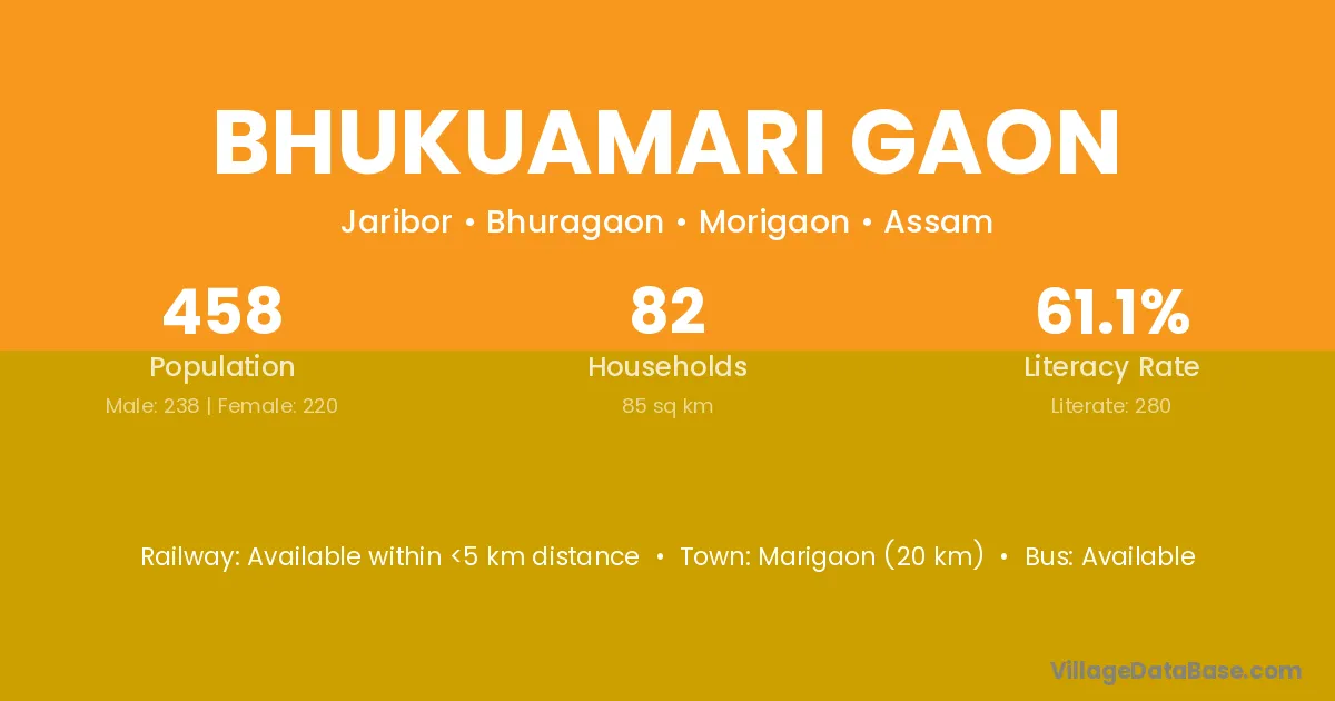Bhukuamari Gaon village has a total population of 458 people, of which 238 are males and 220 are females.