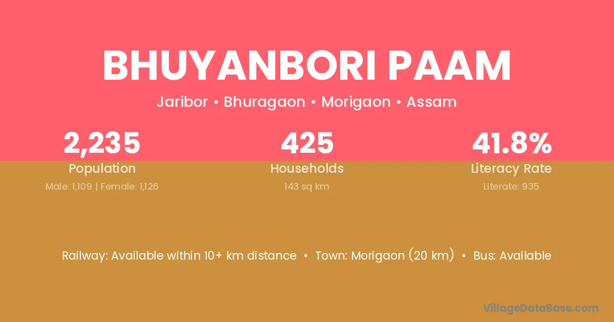 Bhuyanbori Paam village has a total population of 2,235 people, of which 1,109 are males and 1,126 are females.
