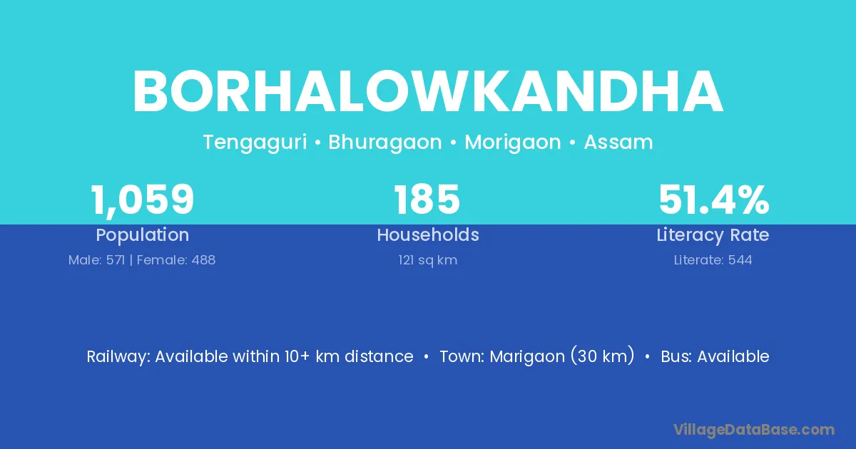 Marigaon (30 km) is the nearest town to Borhalowkandha village for major economic activities and is located approximately 30 km away.