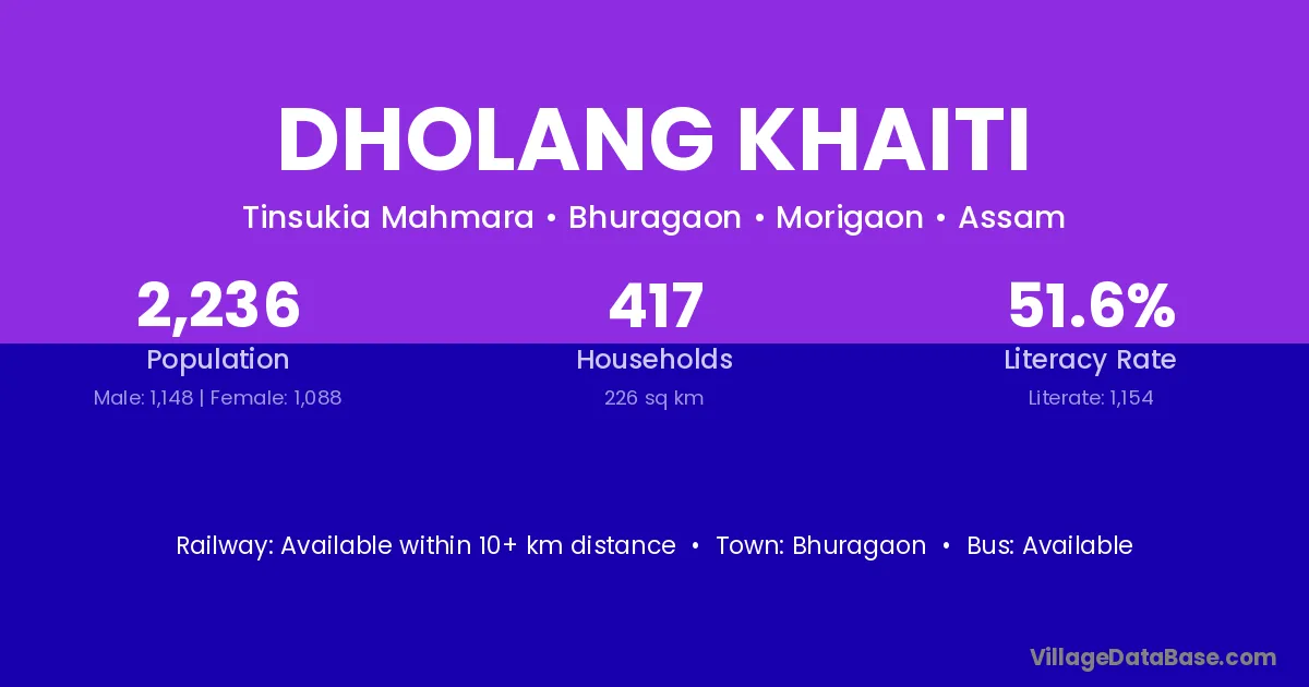 Dholang Khaiti village has a total population of 2,236 people, of which 1,148 are males and 1,088 are females.