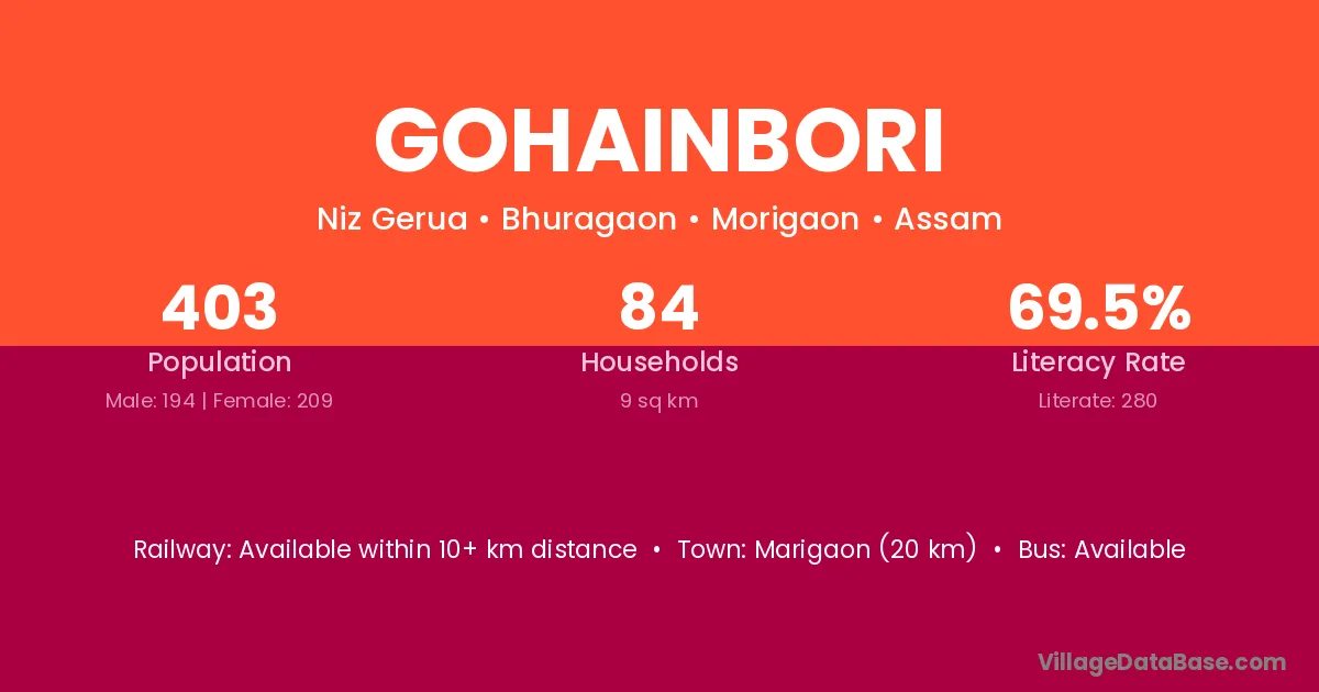Marigaon (20 km) is the nearest town to Gohainbori village for major economic activities and is located approximately 20 km away.