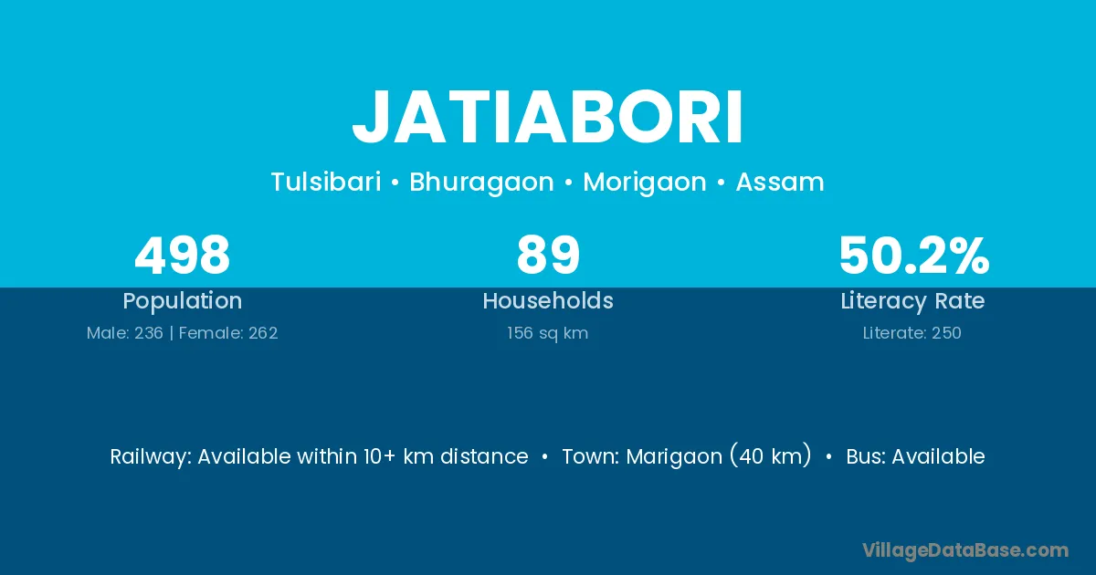 Marigaon (40 km) is the nearest town to Jatiabori village for major economic activities and is located approximately 40 km away.