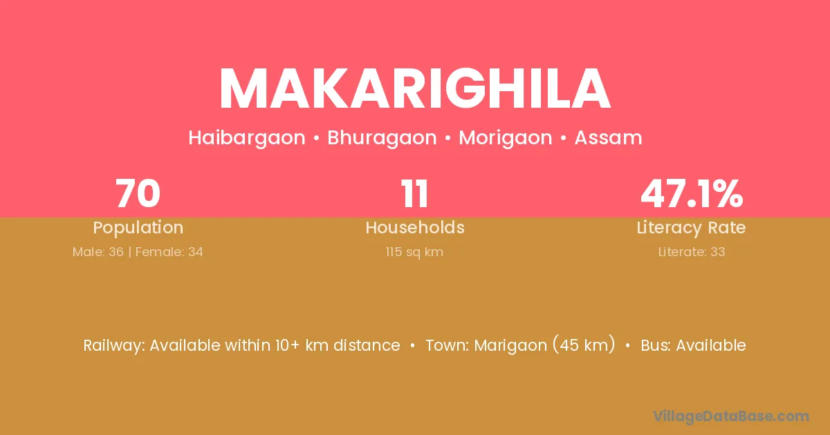 Marigaon (45 km) is the nearest town to Makarighila village for major economic activities and is located approximately 45 km away.