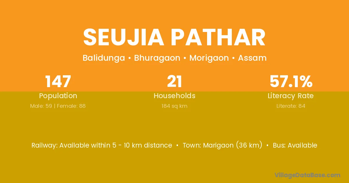 Marigaon (36 km) is the nearest town to Seujia Pathar village for major economic activities and is located approximately 36 km away.
